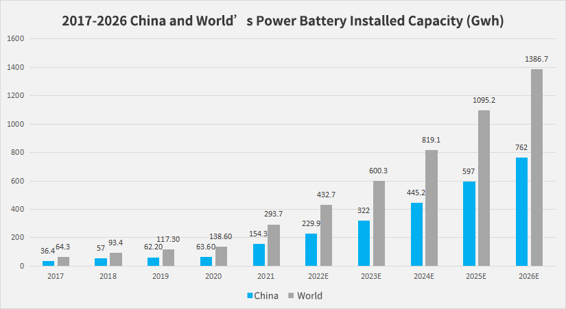 China is the largest power battery market, mainly because it has the largest new energy vehicle consumer market, the most complete power battery industry chain, a complete policy support system, and many outstanding enterprises with international competitiveness, which enables China's complete industry chain to group out of overseas. According to the China Automotive Power Battery Industry Innovation Alliance, between 2017 and 2021, China's installed power battery capacity grew at a compound annual growth rate of 43.5%, reaching 154.5 GWh in 2021. With the rapid growth of new energy vehicle penetration, the healthy development of the industry chain, and the effective control of the Covid-19 pandemic, China's installed power battery capacity is expected to reach 762.0 GWh in 2026.
