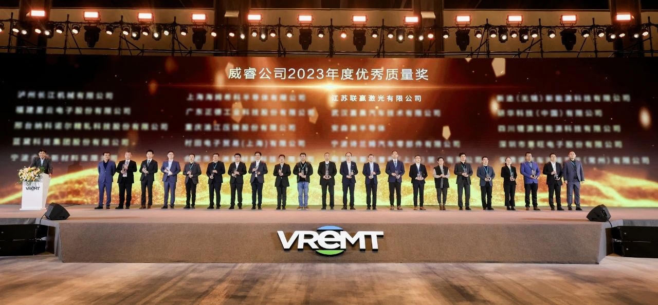 On March 11th, VREMT successfully held its 2023 Supplier Partner Conference with the theme of "Unite in Purpose, Strive for Excellence" at Hangzhou International Expo Center (the main venue of the G20 Hangzhou Summit). As a core supplier of smart manufacturing equipment for global new energy batteries, UW Laser was invited to attend. With outstanding product quality and great R&D capabilities, UW Laser, along with more than 20 colleagues in the automotive industry chain, was honored with the "VREMT 2023 Excellent Quality Award." Mr. Han Junzhi, Vice General Manager of Jiangsu UW Laser, and Mr. Bai Shenglin, Key Account Manager of the New Energy Equipment Division, attended the conference on behalf of kaiyun LASER Co., Ltd. and received the award.