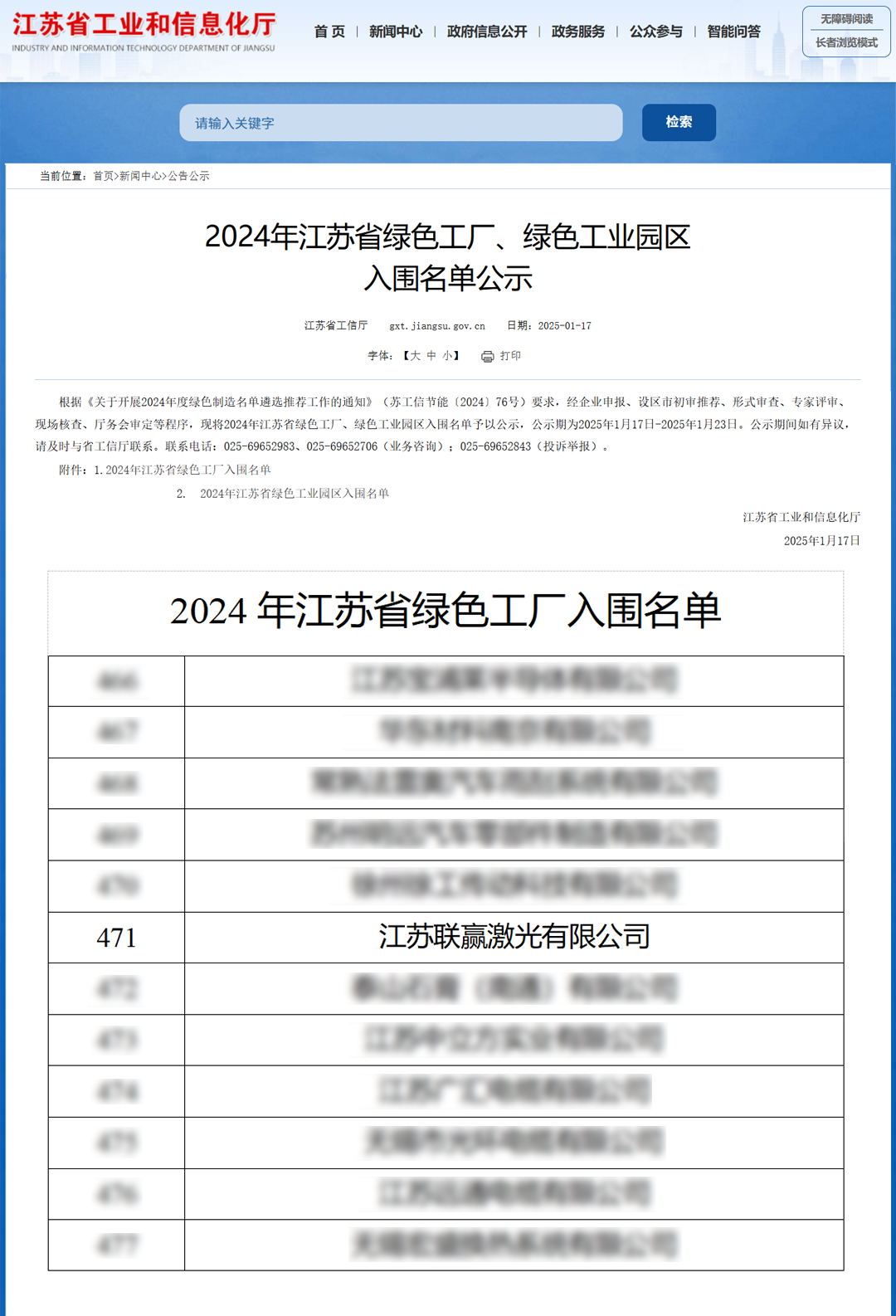 Recently, the Industry and Information Technology Department of Jiangsu announced the list of Green Factories in Jiangsu Province for 2024, and Jiangsu United Winners Laser Co., Ltd. was honored to be on the list. This honor not only highly affirms its practices in the field of green and low-carbon, but also injects strong impetus into the continuous exploration of green innovation and deepening of sustainable development.