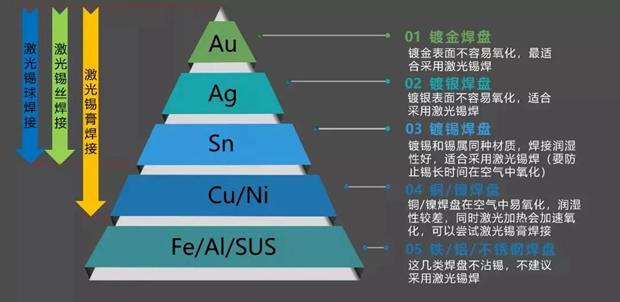 激光锡焊按照锡料状态分为锡膏、锡丝以及锡球激光焊。相比传统波峰焊、回流焊、手工烙铁锡焊等锡焊工艺,激 光 锡 焊 的 激 光 光 源 主 要 为 半 导 体 光 源(808-980nm)。由于半导体光源属近红外波段,具有良好热效应,其特有的光束均匀性与激光能量的持续性,对焊盘的均匀加热、快速升温效果显著,具有焊接效率高、焊接位置可精确控制、焊点一致性好等优势,非常适合小微型电子元器件、结构复杂电路板及 PCB 板等微小复杂结构零件的精密焊接。
