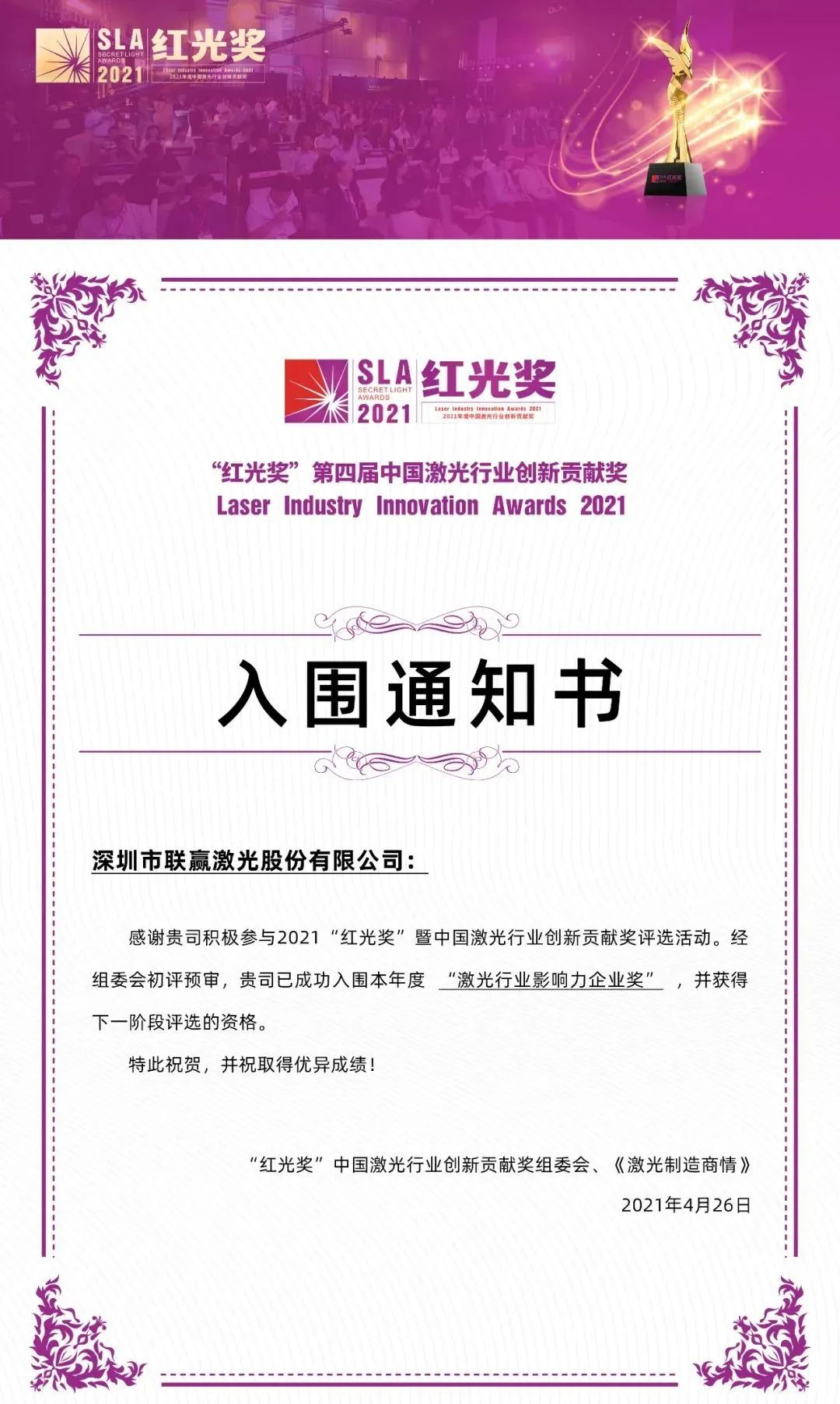 “红光奖”2021年度激光行业影响力企业奖
