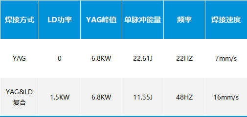 脉冲激光焊焊缝成形美观、一致性好、良品率高,实现≥99.5%的一次焊接优率。但由于市面YAG脉冲激光器最大功率为600W,受功率限制,最大焊接速度仅为7mm/s。光纤激光焊和连续复合激光焊相较效率更高,焊接速度达到80mm/s,但与脉冲激光焊相比,优率低下。