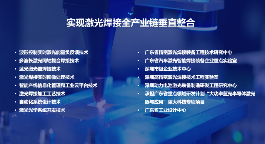 公司突破激光焊接关键核心技术,现拥有专利434项,实现激光焊接垂直整合。产品广泛应用到动力电池、汽车制造、消费电子、五金家电、光通讯、医疗器械、传感器、塑料焊及锡焊等领域。并凭借出色的品质和服务赢得宁德时代、蜂巢能源、亿纬锂能、泰科电子等行业知名企业的广泛认可。