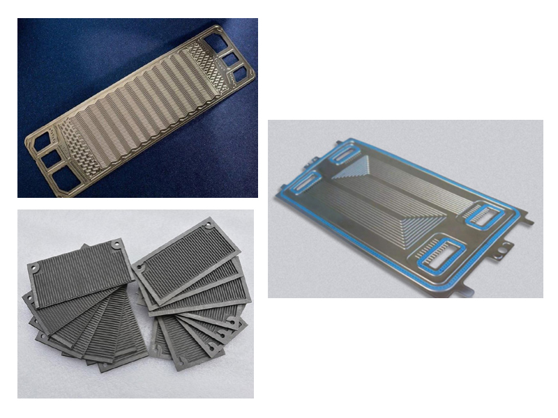 双极板(简称BPP)主要作用为支撑MEA、提供氢气、氧气和冷却液流体通道并分隔氢气和氧气、收集电子、传导热量。常见的双极板材料有石墨、复合材料和金属。金属材料具有机械强度高、体相电导和热导优良,容易制成薄板并冲压加工成型的特点,其应用最为广泛。