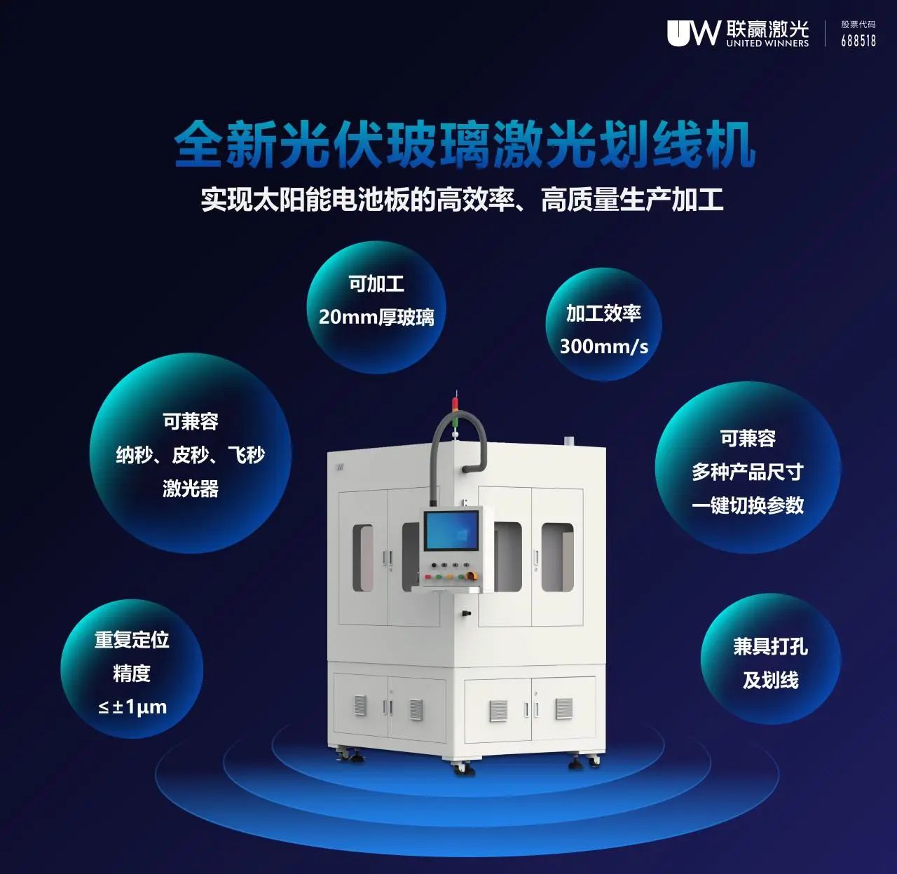 kaiyun开云激光全新上市的光伏玻璃激光划线机,同时兼具打孔、划线工序,进一步简化工艺流程,实现快速、精确和一致的激光打孔及划线,避免产生微裂纹和剥落碎屑的问题,提高产量,降低次品率;另外,无需额外的工艺步骤和化学物质,具有高精度、高效率和非接触式的特点,实现太阳能电池板高效率、高质量、低成本生产加工。