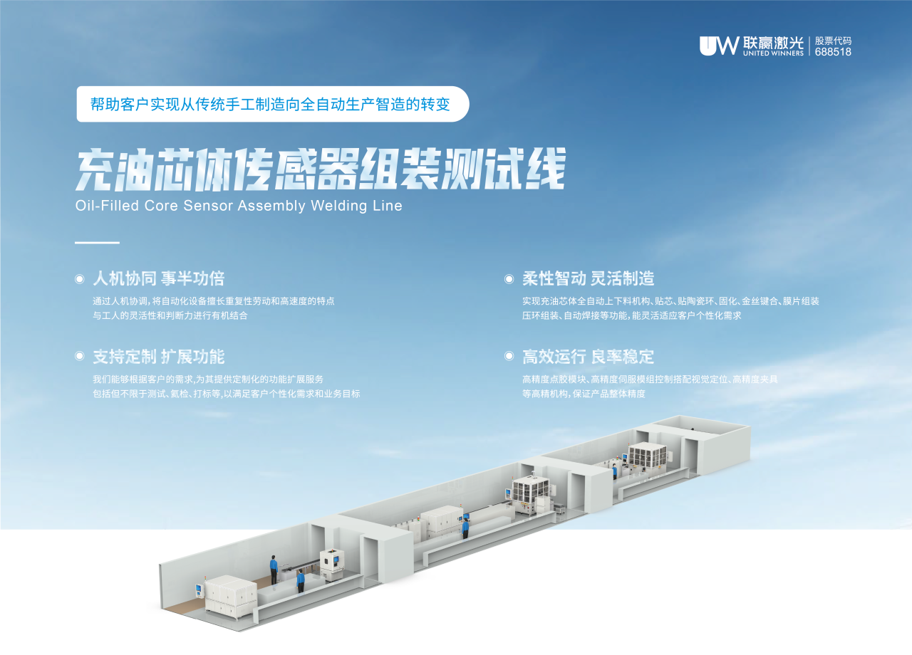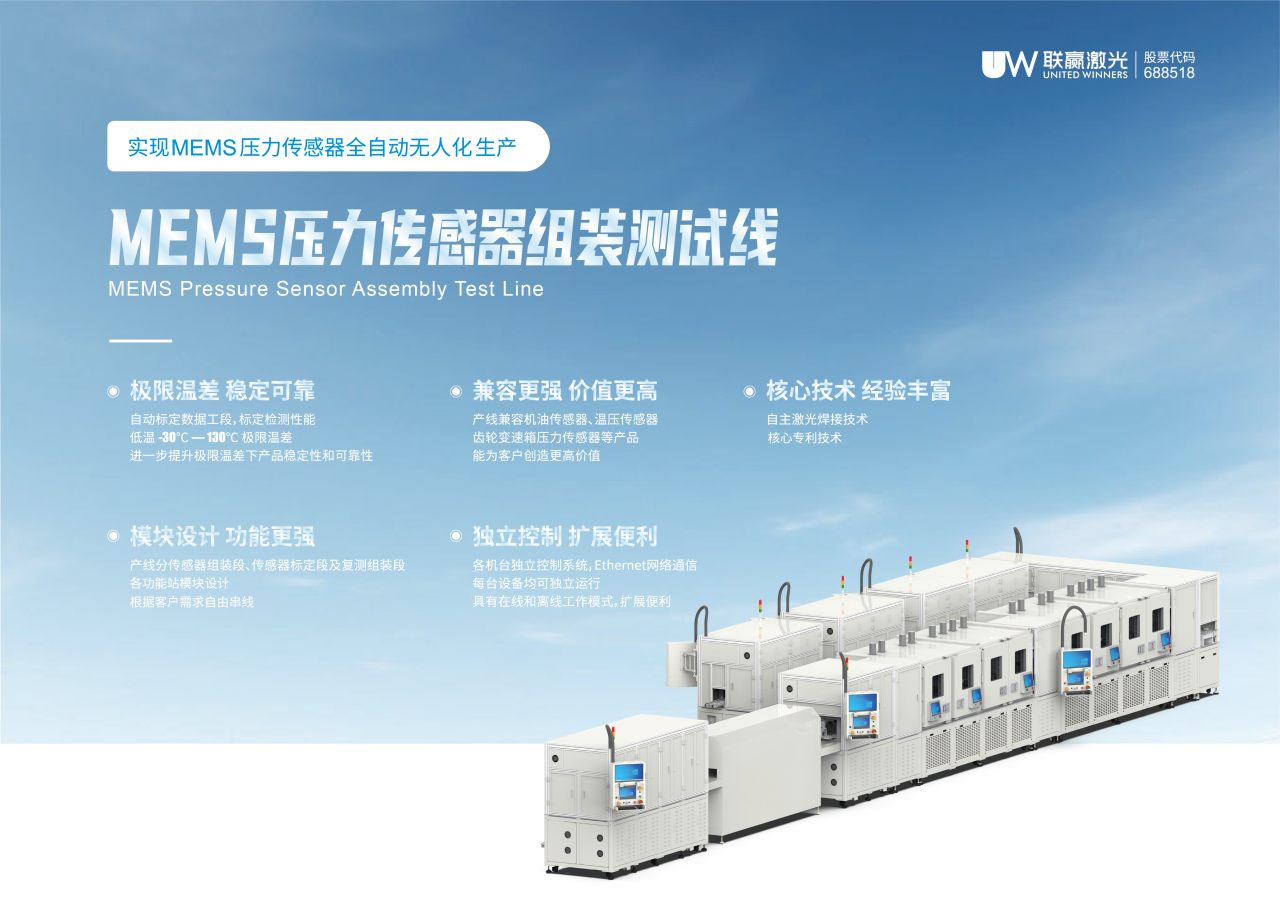 除本次展示的产品外,kaiyun开云激光在传感器领域还拥有点胶自动线、传感器组装标定测试线、全自动激光锡焊、自动贴芯线、膜盒传感器焊接线等解决方案。我们能根据客户不同需求,为其提供定制化的功能扩展服务,其中包括但不限于测试、氦检、打标等,助力客户实现高质量传感器的智能化生产。