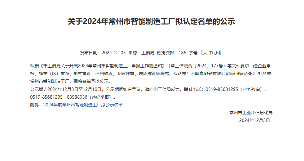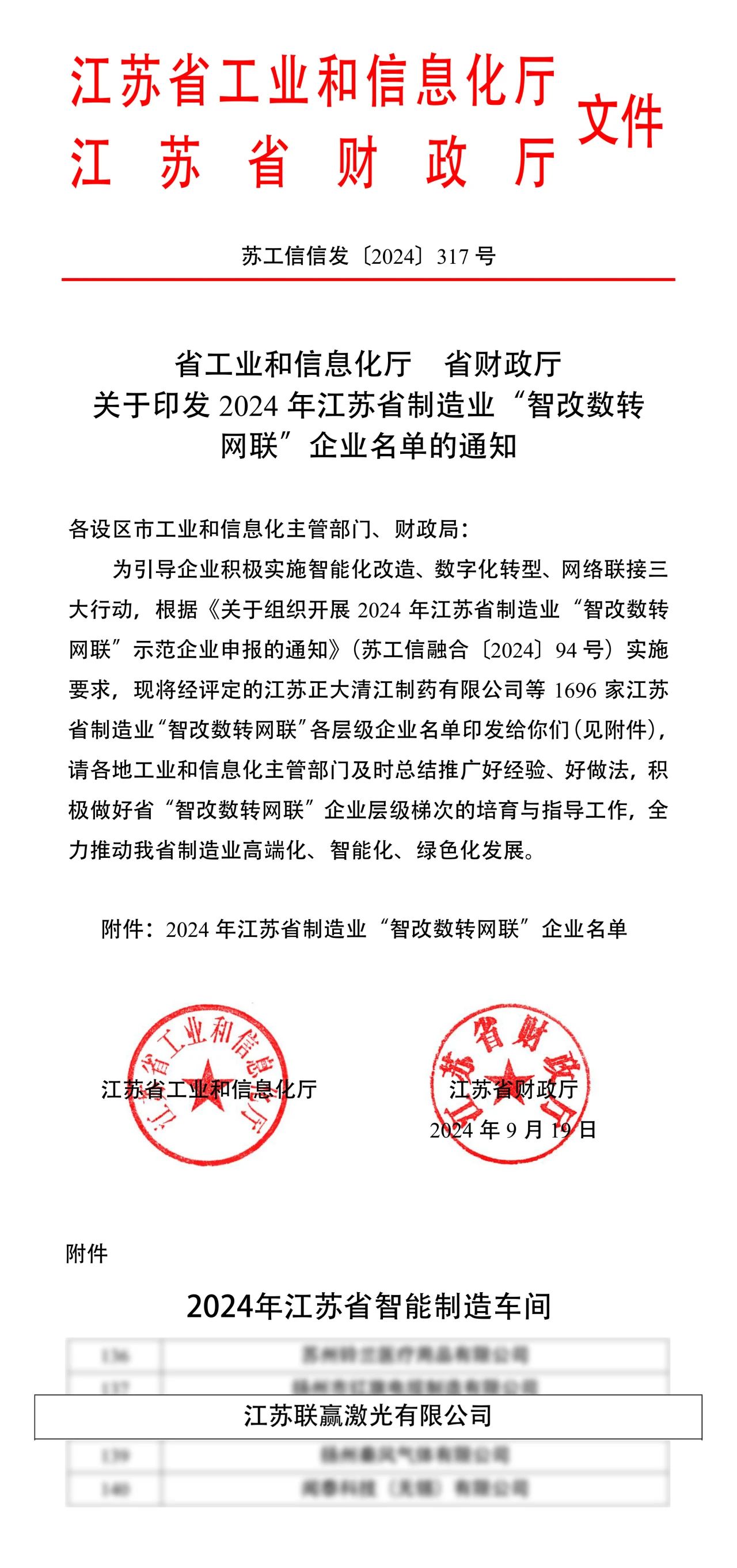近日,江苏省工业和信息化厅正式公布了2024年度江苏省智能制造车间名单,江苏kaiyun开云激光有限公司凭借其出色的智能化改造和数字化转型成果,成功入选“江苏省智能制造车间”,这是江苏kaiyun开云自2023年首次获评“江苏省智能制造车间”以来,第二次获此殊荣!同时,江苏kaiyun开云凭借卓越的智能制造实力,成功获评“常州市智能制造工厂”认定。