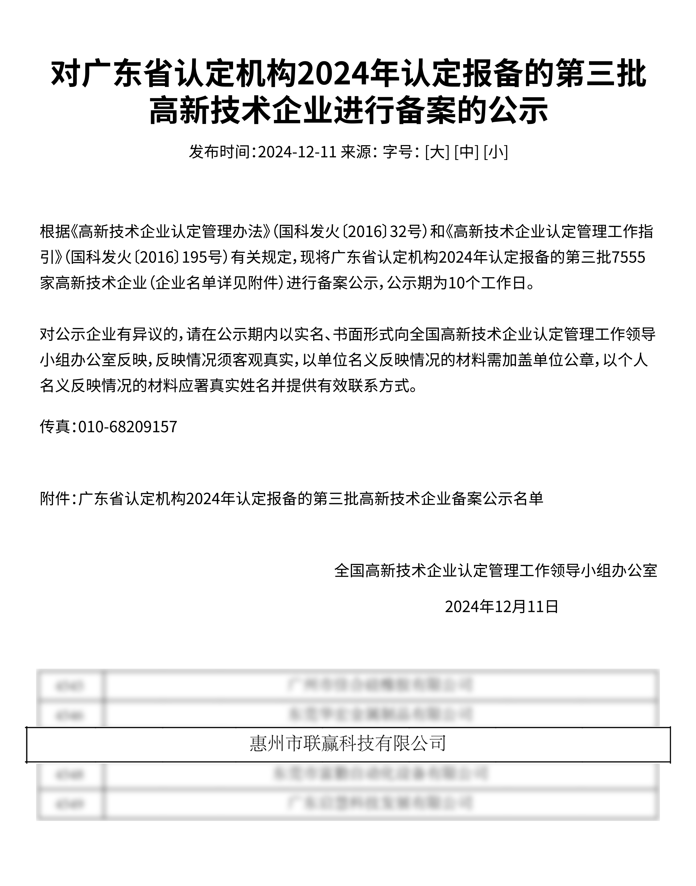 2024年12月11日,根据国家科技部、财政部、税务总局联合发布的《高新技术企业认定管理办法》(国科发火〔2016〕32号)及《高新技术企业认定管理工作指引》(国科发火〔2016〕195号)的严格标准,全国高新技术企业认定管理工作领导小组办公室发布《对广东省认定机构2024年认定报备的第三批高新技术企业进行备案的公告》,经评定公示,惠州市kaiyun开云科技有限公司凭借行业的卓越贡献与持续创新能力,正式通过国家高新技术企业认定!