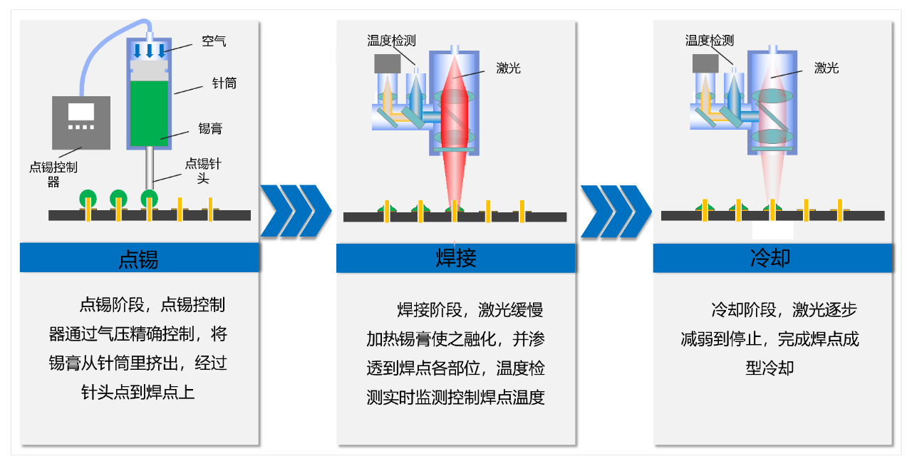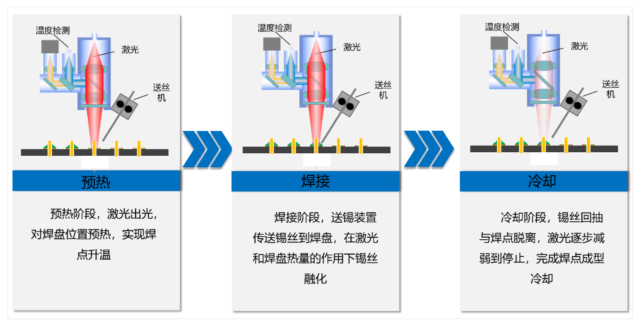 激光预热焊件后,自动送丝机构将锡丝送到指定位置后,激光将低于焊件的焊料熔化完成焊接。